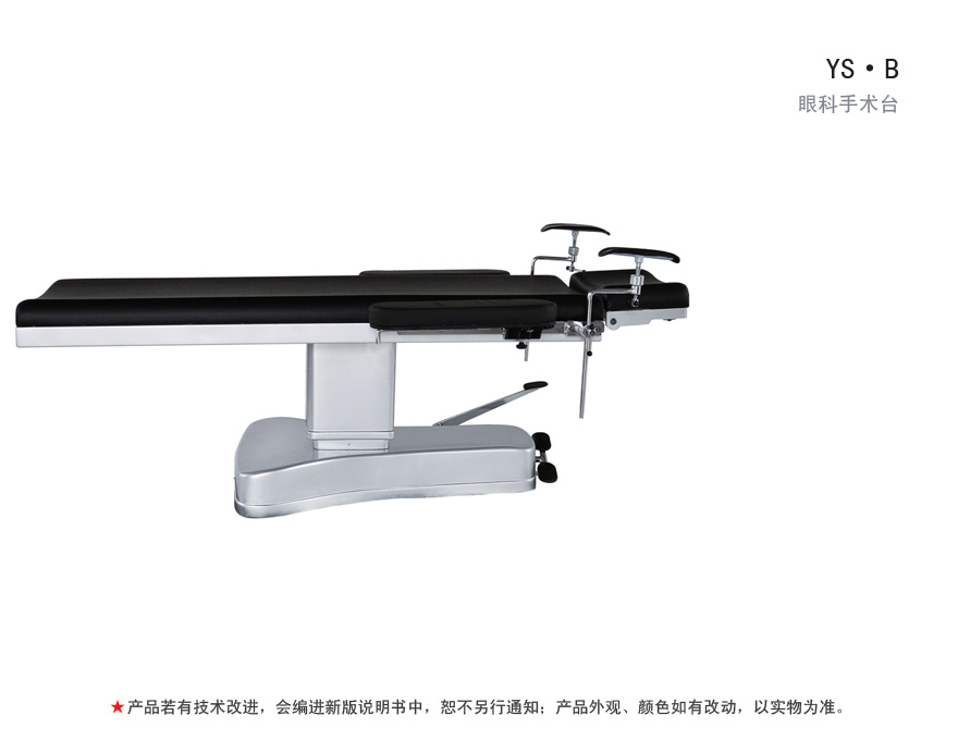 YS·B 型眼科手术台根据手术的特殊要求而设计和开发的一种眼科手术床,可满足眼科手术需要。 超低位设计,可满足医生坐着手术。 采用脚踏液压升降。 进口密封圈,经久耐用。 底座采用高强度ABS一次成型,耐腐蚀、易清洗。 脚踏刹车控制,方便手术台移位。 搁臂架一付、托膀架一付、头架一个。