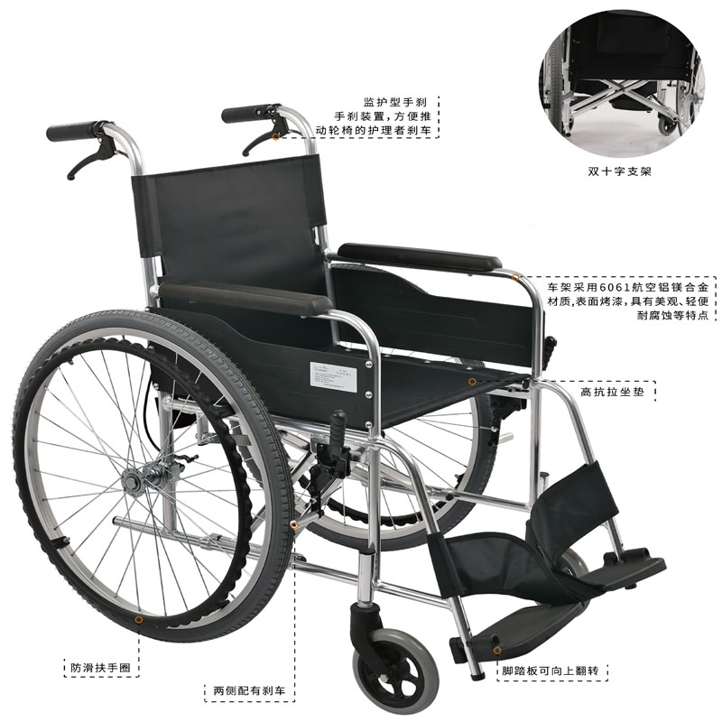 监护型手刹,手刹装置,方便推动轮椅的护理者刹车。 车架采用6061航空铝镁合金材质,表面烤漆,具有美观、轻便耐腐蚀等特点。 脚踏板可向上翻转。 两侧配有刹车。 防滑扶手圈。 高抗拉坐垫。